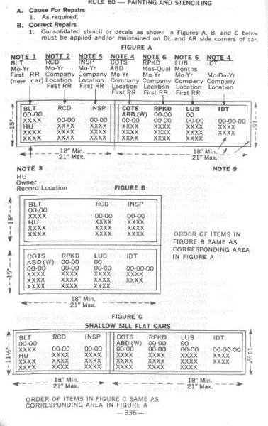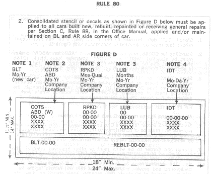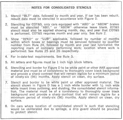 The A.A.R. began a program of consolidated Stencils in 1972 which applied to new or rebuilt freight cars only. Application to existing cars was not mandatory. The F.R.A.(Federal Railroad Administration)created in 1966 issued in July 1974 a mandate for all freight cars to begin having the new consolidated stencils applied. These stencils are applied on the lower right end when facing the car side.On January 1, 1982 the F.R.A. no longer required a perodic inspection so the inspection & reconditioned dates were eliminated from the consolidated stencils. The A.A.R. changed the Consolidated Stencil to contain only the COT&S, lubrication and IDT. TOP