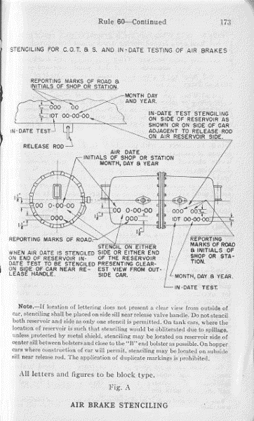 COT&S(Clean, Oil, Test & Stencil)is rule 60 of the 1966 AAR Interchange Rules and applies to the air brake equipment on freight cars. Maximum period of COTS is 4 years for AB type brake equipment. These are maximum times before replacement of certain componnents if no improper operation/damage is noted during routine testing under In-Date testing, which is every 90 days.COT&S(Clean, Oil, Test & Stencil)is rule 2 of the 1980 AAR Interchange Rules and applies to the air brake equipment on freight cars. Maximum period of COTS is 8 years for AB, AB-1-B, ABC-1 and ABD-1. Maximum period for ABD, ABD-1-B, ABDW, and ABDW-1-B types is 16 years. These are maximum times if no damage is noted during routine testing under IDT&S. 1980 IDT&S(In-Date, Test & Stencil is done routinely at periods not exceeding 90 days from the last COT&S or IDT&S. For detail information refer to a copy of the "Field Manual of the A.A.R. Interchange Rules" for The time period modeled. These can often be found at train shows and on internet auctions. TOP